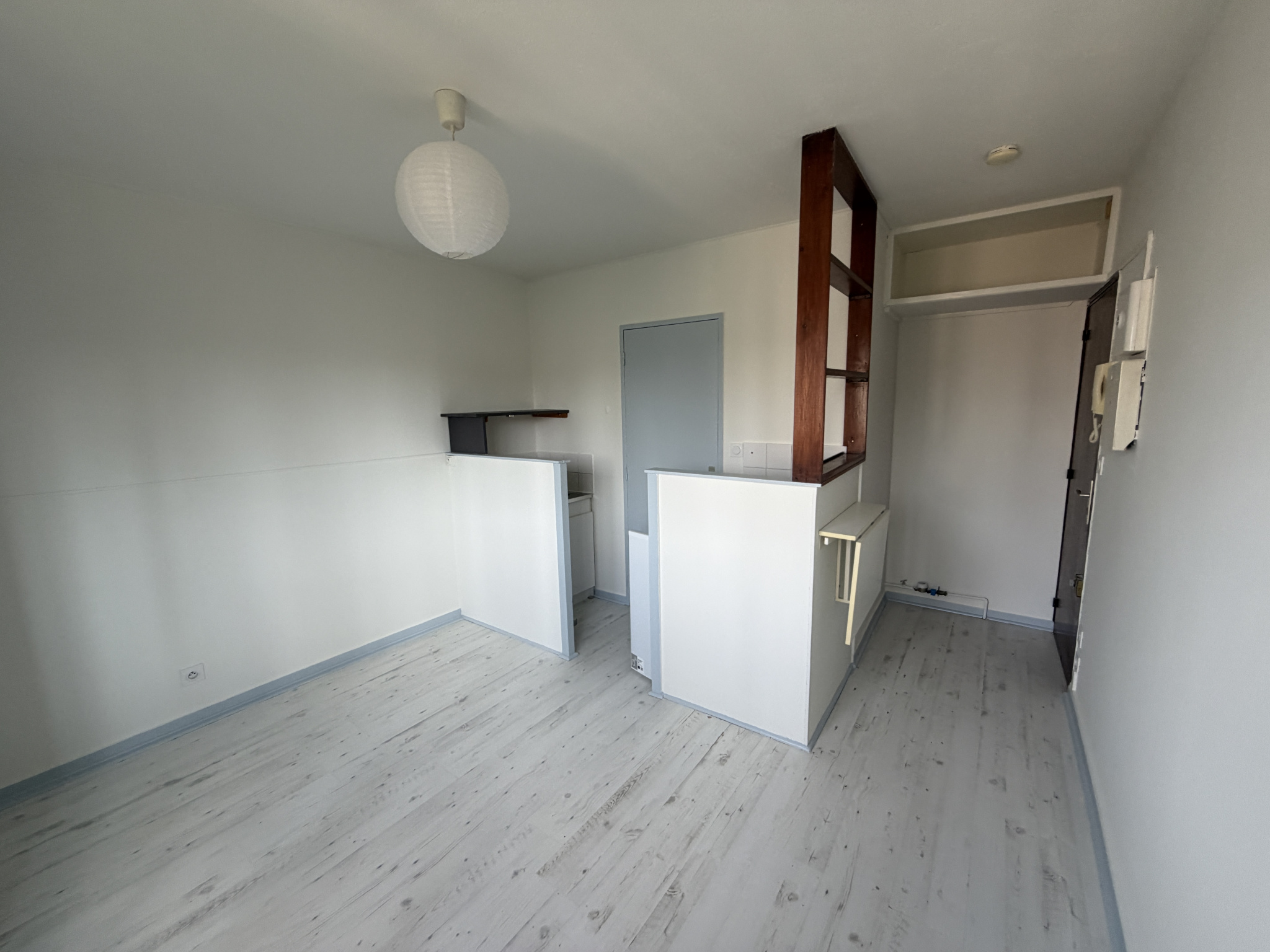 Il est composé d'une entrée indépendante : au 1er étage, le pallier privatif dessert un WC séparé et l'entrée de l'appartement. La cuisine est semi-équipée (frigo, plaques, rangements, petit four et micro-onde). La chambre est séparée, et dispose de rangements (commode et penderie au sol), et est attenante à la salle d'eau.