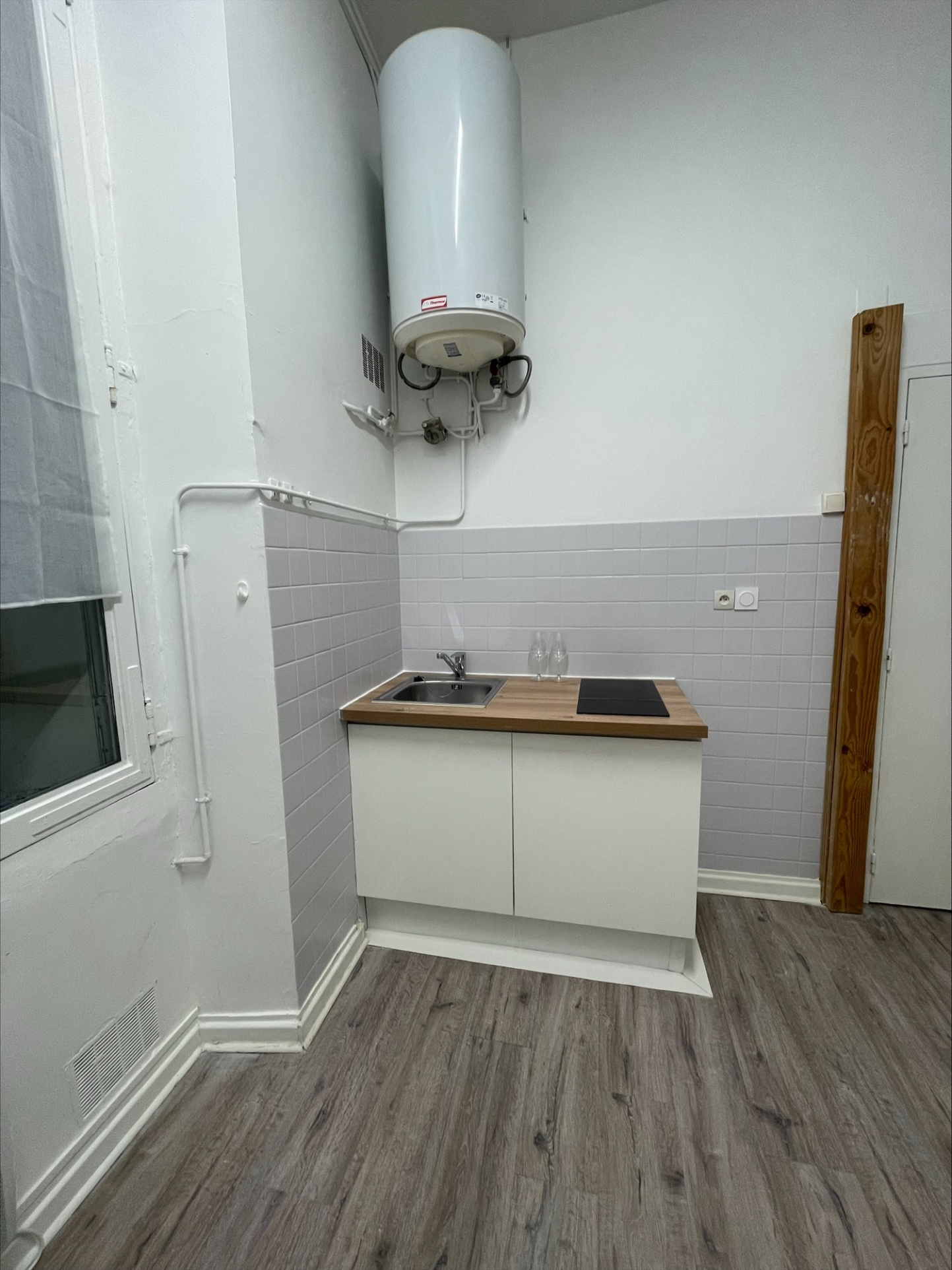 Il est composé d'une entrée indépendante : au 1er étage, le pallier privatif dessert un WC séparé et l'entrée de l'appartement. La cuisine est semi-équipée (frigo, plaques, rangements, petit four et micro-onde). La chambre est séparée, et dispose de rangements (commode et penderie au sol), et est attenante à la salle d'eau.