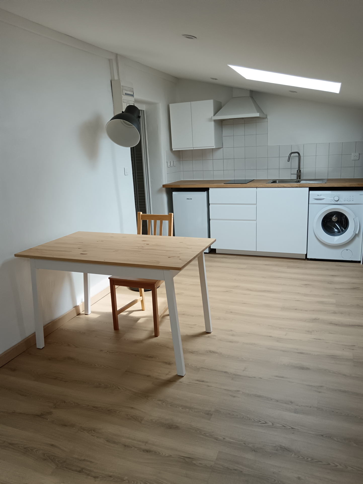 Cuisine équipée - frigo, plaques, hotte, lave-linge.